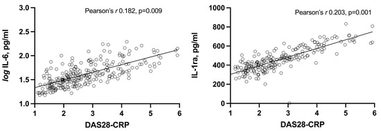 3.3. Correlation of IL-6 and IL-1ra with Each Other and with Disease Activity Parameters