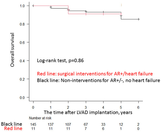 A Kaplan–Meier analysis of the enrolled patients (n = 156) showed that the freedom rate from all-cause mortality after Cf-LVAD implantation was not significantly different for surgical AV interventions (AVP, AVR, and complete AV closure) for AR-related HF at 5 years of follow-up compared with non-surgical AV interventions, including conservative therapies for both AR and non-AR (log-rank test, p = 0.86) (Figure 3).