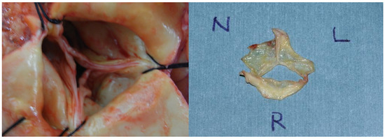 Pathology of aortic valve regurgitation in two unpublished cases. (Left): prolapse of one leaflet (non-coronary cusp, in this case). (Right): degenerative alteration of the right coronary cusp.