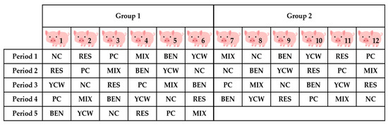 A replicated 6 × 5 incomplete Latin square design was employed using 12 animals, 6 experimental diets, and 5 periods balanced for potential carryover effects [19]. During period 5, only 6 pigs were used due to the lack of experimental diets, resulting in 9 observations for each treatment. PC = positive control of uncontaminated diet; RES = restricted feeding of an uncontaminated diet at the level of feed intake as in the negative control (NC) group; NC = deoxynivalenol-contaminated diet; BEN = NC + 0.5% bentonite; YCW = NC + 0.5% yeast cell wall; MIX = NC + 0.5% mixture product consisting of enzymes, microorganisms, minerals, and plant extracts.