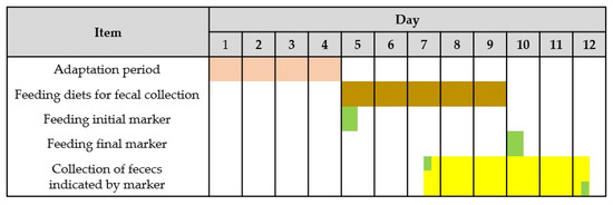 All pigs were individually housed in metabolism crates equipped with a feeder and a nipple drinker. Individual BW was recorded at the beginning of each period. All pigs except those in the RES group had ad libitum access to the diets. Water was freely available at all times. Each period consisted of 4-day feeding for adaptation and 5-day feeding for fecal collection (Figure 2). During the 5-day feeding period for fecal collection, a total collection method was used to collect feces with the marker-to-marker procedure. Chromium oxide was used as an indigestible marker for the initiation and termination of fecal collection. After feeding the initial and terminal marker to pigs in the morning of days 5 and 10, respectively, it took 2 to 3 days to the excretion of feces indicated by the marker color. During the collection period, feed refusals were collected to calculate the amount of actual feed intake.