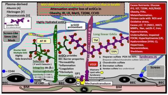 Structural components of the brain endothelial cell (BEC) glycocalyx (ecGCx) of the neurovascular unit (NVU) blood–brain barrier (BBB). This image depicts the individual components of the ecGCx, which is a unique apical BEC extracellular matrix. The ecGCx contains two classes of proteins that are primarily anchored, proteoglycan(s) (PGN) (of purple coloration) and glycoprotein(s) (GP) (of green coloration), and the glycosaminoglycans (GAGs) of hyaluronic acid (HA) hyaluronan (exceedingly long polymers up to micrometers in length and up to 40–60,000 kDa that are composed of uronic acid and hexosamine disaccharides (blue coloration). HA may be either free-floating (unattached), or attached to the CD44 cell BEC basilar plasma membrane, or form complexes of HA-HA. Non-sulfated HAs that are not anchored to the BECs may also reversibly interact at the lumen with plasma-derived albumin, fibrinogen, orosomucoids, and soluble PGNs [11,12]. The PGNs and GPs’ side chains consist of glycosaminoglycans (GAGs) covalently bound to core proteins that are highly sulfated (red dots) that contribute heavily to the net negative electrostatic charge of the ecGCx [11,13]. The two primary PGNs are syndecans and glypicans (purple). Glycoproteins (green) consist primarily of selectins (P and E), integrins (beta 3 and alpha v), and the immunoglobulin superfamily of ICAM-1, VE-CAM, and PE CAM. The BEC plasma membrane is where caveolar lipid rafts are located and contains CD44, which anchors hyaluronan (hyaluronic acid-HA), and glycosylphosphatidylinositol (GPI), that anchors glypican-1. Importantly, the GPI/glypican-1 interaction is thought to be responsible for mechanotransduction, which allows activation of endothelial nitric oxide synthase (eNOS) to synthesize vasculoprotective bioavailable nitric oxide (NO) via the calcium-calmodulin-dependent Caveolin-1 (Cav-1) protein. The soluble components of the ecGCx that are also important in the preservation of the important net negative electrostatic charge selectivity (orosomucoids and albumin) are derived from the bloodstream [11,13,14]. Note the upper right red box, which contains multiple factors that are known to be responsible for the perturbation of the ecGCx. Also, orosomucoids and the highly sulfated residues (red dots) are primarily responsible for the net negative change of the ecGCx [11,14]. Importantly, note the insertion of the mesh-like screen images, which give the ecGCx its sieving-like properties, that are placed to the left- and right-hand side of HA (blue). This illustration is not to scale. Images are modified with permission from CC 4.0 [6,7]. AGE/RAGE = advanced glycation end-products and its receptor; aMt = aberrant mitochondria; ATIII = antithrombin III; CD44 = cluster of differentiation 44; CNS CC = central nervous system cytokines/chemokines; ecSOD = extracellular superoxide dismutase; FFAs = saturated free fatty acids; FOCM = folate-mediated one-carbon metabolism; HHCY = hyperhomocysteinemia; IFG = impaired fasting glucose; IGT = impaired glucose tolerance; IR = insulin resistance; LR = leptin resistance; ox-LDL-C = oxidized low-density lipoprotein-cholesterol; MMPs = matrix metalloproteinases; mtROS = mitochondrial reactive oxygen species; Na+ = sodium; N = nucleus; PCC = peripheral cytokine/chemokines; RAGE = receptor for AGE; RONSS = reactive oxygen, nitrogen, sulfur species; ROS = reactive oxygen species; RSI = reactive species interactome; T2DM = type 2 diabetes mellitus; TFPI = tissue factor pathway inhibitor; TJ/AJ = tight and adherens junctions; TM = thrombomodulin;; VE CAD = vascular endothelial cadherin.