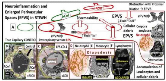 Perturbation of the endothelial glycocalyx results in brain injury to the brain endothelial cells (BECs) with activation of the response to injury wound healing mechanism that results in remodeling, neuroinflammation, and enlarged perivascular spaces (EPVSs). Panel (A) depicts the natural progression of the perivascular space (PVS) as it undergoes transformation or remodeling to an EPVS (outlined in red) in a linear fashion from the left- to right-hand side of this image (outlined in red). Panel (B) depicts transmission electron microscopic (TEM) images of a true capillary without a pia mater lining or PVS in a healthy control 20-week-old female model. Panel (C) depicts an EPVS that contains a resident, reactive, and migratory perivascular macrophage (rPVMΦ) obtained from a 7-week-old female lipopolysaccharide (LPS)-treated model. Panels (D–F) depict labeled leukocytes that undergo diapedesis across the disrupted BBB neurovascular unit (NVU) brain endothelial cells (BECs), which enter the newly remodeled EPVSs that interact with the rPVMΦs. These leukocytes that have entered the PVSs are capable of generating excessive phagocytic cellular debris due to reactive oxygen species and proteases generated by reactive leukocytes. Further, this increase in reactive leukocytes and rPVMΦs along with their excessive cellular debris result in obstruction of the PVS, which result in the dilation of the PVS proximal to the obstruction, creating the EPVS as observed on magnetic resonance imaging (MRI), such as those that occur in the basal ganglia and centrum semiovale structures in the white matter, and post-capillary venules that are important in the efflux of waste materials to the cerebrospinal fluid in cerebral small vessel disease and neurodegenerative diseases. Panels (A–F) depict the two-step process to neuroinflammation, while panel (A) only depicts step one comprised of leukocyte transmigration from the disrupted blood–brain barrier (BBB) into the PVS of a two-step process. Step two is known to allow for the incorporation of the generated reactive oxygen species and matrix metalloproteinases (MMP2, MMP9) from reactive leukocytes, which are capable of digesting the glia limitans basement membrane barrier of the outermost boundary of the EPVS created by the lining perivascular astrocytes. Subsequently this will allow for the transmigration of leukocytes from the EPVS to enter the interstitial spaces of the parenchymal neurons to complete the neuroinflammation remodeling mechanism that is present in obesity, metabolic syndrome, and type 2 diabetes mellitus. This image has been modified with permission from CC 4.0 [19]. ACef = astrocyte endfeet; CL = capillary lumen; EPVS = enlarged perivascular space; rPVMΦ = resident perivascular macrophage.