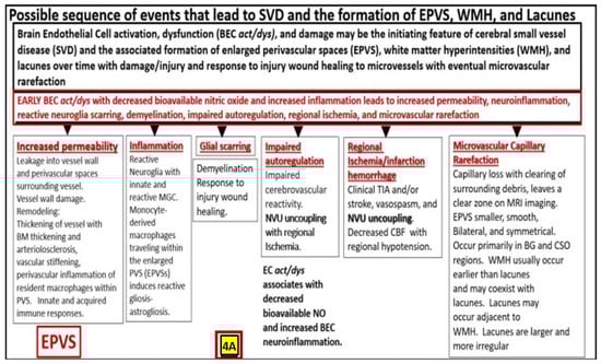 A likely sequence of events and an ongoing spectrum of development for enlarged perivascular spaces (EPVS). Brain endothelial cell activation, dysfunction, and damage may be the initiating factor in this sequence of events in figure four, while attenuation and/or loss of the endothelial glycocalyx may be concurrent or even precede it. Also, there exists a sequence of remodeling changes and events in figure four crucial in the development of EPVS, white matter hyperintensities, lacunes and small vessel disease. Images provided with permission from CC 4.0 [19,20,28]. ACfp = astrocyte endfeet; BBB = blood–brain barrier; BEC = brain endothelial cell; BEC act/dys = brain endothelial cell activation and dysfunction; BG = basal ganglia; BM = basement membrane; CBF = cerebral blood flow; CSF = cerebrospinal fluid; CSO = centrum semiovale; ISF = interstitial fluid; LOAD = late-onset Alzheimer’s disease; MGC = microglia cell; mm = micrometer; MRI = magnetic resonance imaging; NO = nitric oxide; NVU = neurovascular unit; PVS = perivascular spaces; spaces; SAS = subarachnoid space; TIA = transient ischemic attack. WMH = white matter hyperintensities.