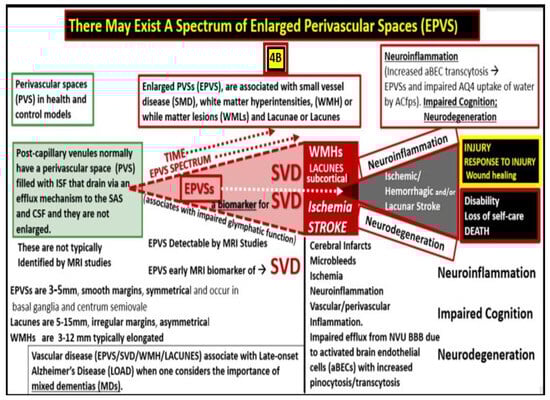 EPVS are thought to have numerous causes from multiple mechanisms including: (1) Increased fluid and neurotoxic proteins that enter the PVS due to BBB dysfunction/disruption as a result of increased permeability. (2) Increased fluid inflow into the PVS due to increased BBB permeability as a result of BBB disruption and concurrent astrocyte endfeet (ACef) dysfunction, detachment, separation, and aquaporin-4 dysfunction with decreased water uptake allowing for the accumulation of water in the PVS. (3) The stalling or obstruction of impaired glymphatic efflux of the PVS conduit due to inflammation as a result of the accumulation of excess leukocytes with phagocytosis and the accumulation of excessive phagocytic debris and oxidative stress, in addition to the activation of increased matrix metalloproteinases (MMPs) that result in stagnation, stalling, and/or varying degrees of PVS conduit glymphatic system obstruction of the waste removal mechanisms. (4) Microvascular arteriole or venule vascular stiffening and/or aberrant spiraling of arterioles that are associated with decreased vascular pulsatility, which result in decreased fluid flow within the PVS, which contributes to PVS enlargement (mechanisms [1,2,3,4] that were discussed in Figure 3 and its legend previously). Or (5) neuronal atrophy or apoptosis surrounding neurons or their axons [19,20,21,22,23,24,25,26,27,28]. Notably, EPVS do not develop all at once, but are thought to be associated with a sequence of events and exist as in an evolutionary spectrum, such that they develop gradually to result in SVD, neuroinflammation, impaired cognition, and neurodegeneration (Figure 4A,B) [19,20,28].