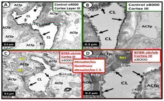 These electron micrographs depict the attenuation, loss, or discontinuous brain endothelial cell glycocalyx (ecGCx) in lanthanum nitrate-stained, obese, insulin-resistant, diabetic BTBR ob/ob at 20 weeks of age in female mouse models. Panels (A,B) are from the normal control model (heterozygous BTBR ob/ob) and demonstrated the normal lanthanum staining of the ecGCx and note the continuous electron-dense nature of this surface coating layer with lanthanum. Panels (C,D) depict the small black discontinuous dots (clumping) and attenuation in contrast to the continuous ecGCx in control models. These remodeling changes would contribute to increased permeability at the NVU BBB to allow the passage of fluid and inflammatory leukocytes into the perivascular spaces to result in enlargement. Thus, these findings rendered the BBB disrupted due to perturbations of its ecGCx. Reproduction of this modified image is permitted by CC 4.0 [6].