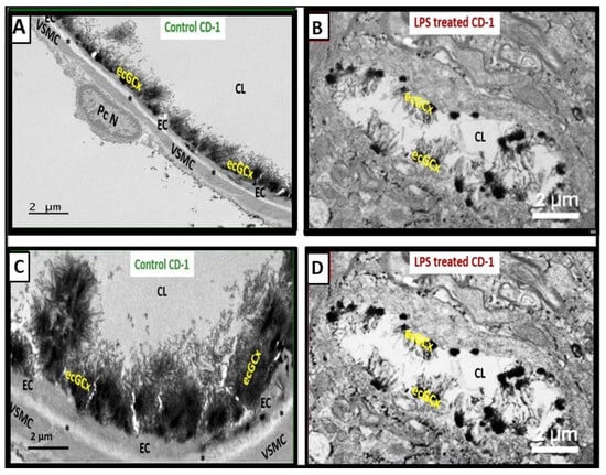 LAN-perfused images in Figure 6 only had an n = 2; therefore, the data collected were too small to perform any type of statistical studies in the original experiment [8]. However, these images were only meant to be representative of the perturbation of the ecGCx in LPS-treated neuroinflammatory models. Sampie et al. studied obese, insulin- and leptin-resistant, and diabetic db/db male mouse models at 10 weeks of age treated with LPS and stained via LAN perfusion fixation [37]. This group found that the ecGCx was already thinned in the diabetic db/db models compared to controls and that LPS treatment resulted in further thinning and even shedding in the pulmonary endothelium. Additionally, they also found that LPS treatment delayed the migration of inflammatory cells as well as expanding them and hypothesized that this extended inflammation may be involved in even further ecGCx damage [37]. Also, Erickson et al. demonstrated in a recent study that 7–8-week-old male CD-1 LPS-treated mice had pronounced ultrastructural remodeling changes in BECs that included plasma membrane ruffling, increased pinocytosis, transcytosis, increased numbers of extracellular microvesicles, small exosome formation, and aberrant BEC mitochondria, while TJ/AJ appeared to be intact. Also, Pc were contracted with rounded nuclei and loss of their elongated cytoplasmic processes (retraction). Interrogating microglia cells were attracted to the NVU, and astrocyte detachment and separation were associated with the formation of perivascular spaces and pericapillary edema—EPVS [8].