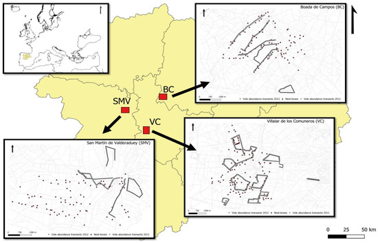 Location of the three experimental areas with nest-boxes for raptors in Castilla y León, NW Spain (red squares). Abbreviations for study areas are used throughout the text. Within the maps of every area, nest-boxes are shown as red triangles, and thick lines mark transects with sampling quadrats of vole presence. Thin lines mark crop field edges. See Figures S1–S3 in Supplementary Materials [SM] for detailed location of quadrats.