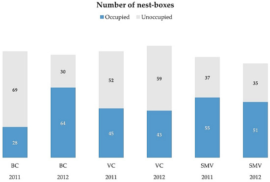 Each nest-box was installed on a vertical pole with a height of 4.5 m. The average distance between nest-boxes was ca. 250 m (Supplementary Materials Table S1). Nest-boxes damaged during the study period were excluded from the study, so the number of nest-boxes for analyses was lower than 100 in some year/study areas. In one of the study areas (VC), a farmer installed several additional nest-boxes in 2012, which have also been included in the analysis, so the area reached a total number of 102 nest-boxes (Figure 2).