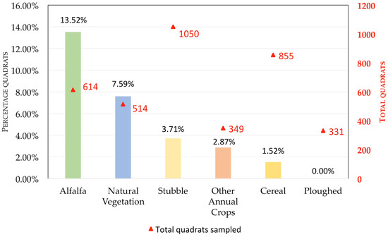 Our results showed that, as expected, the type of habitat significantly affected the index of vole abundance (F5,3706 = 30.86, p < 0.001), with alfalfa having the highest vole abundance, followed by natural vegetation, stubble, cereal, and other annual crops (that had similar, intermediate, vole abundance values), whereas recently ploughed fields had no vole presence at all (Figure 3).