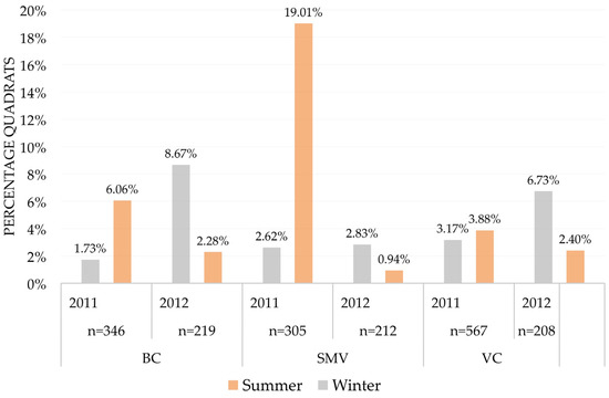 Regarding the main factors affecting variation in vole occurrence, we found significant differences according to season, area, the interaction between year and area, the interaction between season and year, as well as the interaction between area and season (Table 3). The variation in these factors was related to the temporal variation in vole abundance that differed among our study areas and seasons. These interactions arose from the fact that there was a spatial shift in the seasonal and temporal variations in vole abundance among our study areas (Figure 4); we detected an overall increase in vole abundance from the beginning of the study, followed by a reduction. However, the time of the maximum abundance observed and its amplitude varied among areas. In the study area of Zamora, SMV, abundance peaked in the summer of 2011, strongly declining to the winter of 2012, whereas in the other two areas, abundance peaked in the winter of 2012, only declining in the summer of 2012. The variable year per se was not significant in any model (Table 3), whereas both season and area were (Table 3), with winter having an overall lower abundance than summer and SMV being the area with a higher vole abundance (Figure 4). Differences in abundance among seasons also showed variation between years, so abundance tended to be higher in the summer during 2011, but the opposite was found during 2012 (Figure 4). Finally, seasonal variation in abundance was very low in VC, very high in SMV, and intermediate in BC (Figure 4).