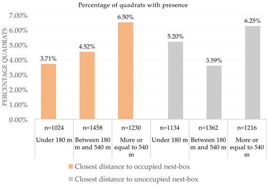 Common vole occurrence (% of quadrats with presence) according to the distance to the closest nest-box, occupied or unoccupied using an indirect abundance index (IAI). Under each column appears the total number of quadrats sampled (n).