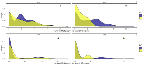 Density histogram of the number of fledglings by quadrat sample within a circular buffer of 540 m radius (A,B), or 180 m radius (C,D), according to the indirect abundance index (IAI), where “1” corresponds to recent activity or presence and “0” refers to no recent activity.