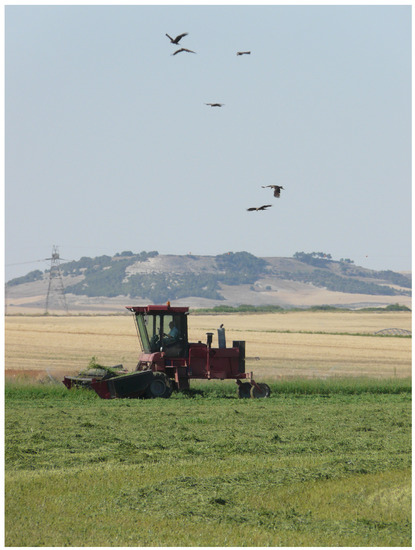 - Promoting the use of temporal perches for raptors (easy to remove, to allow harvesting) within alfalfa fields (see [66,67] for a good example in the Czech Republic).