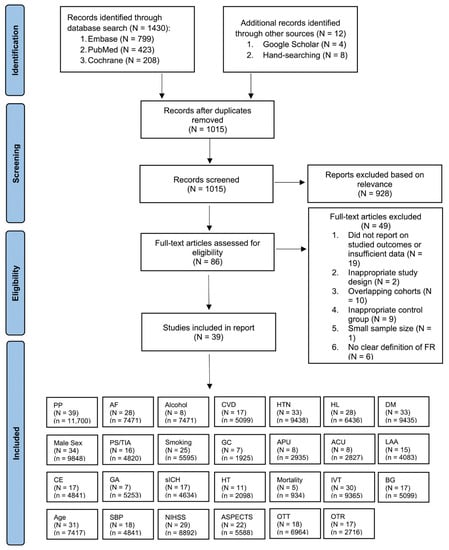 A total of 1430 studies were initially identified by manual and electronic database searches. After removing duplicates, a total of 1015 records remained. Each abstract was meticulously reviewed, leading to the exclusion of 928 records. Among the remaining 86 articles, 49 studies were subsequently excluded for various reasons. Specifically, 19 of these studies did not report the targeted outcomes or lacked sufficient data, while 2 exhibited inappropriate study designs. Additionally, 10 studies were excluded due to overlapping cohorts, 9 had inadequate control groups, 1 had a limited sample size, and 6 lacked a clear definition of FR. Ultimately, a final selection of 39 studies, encompassing a total of 11,700 patients, was included in this meta-analysis. Out of 11,700 patients, FR was observed in 5766 patients. For instances involving reports from the same database or registry, priority was given to studies with the largest or most recent sample size. Of these studies, 3 centered around patients primarily receiving EVT, with or without IVT, while 36 studies focused on patients who primarily underwent EVT with IVT. The mean age of all included studies was 65.6 (n = 11,700). Comprehensive clinical characteristics, associated factors, and outcomes of the studies featured in the meta-analysis are presented in Table 1, Table 2 and Table 3.