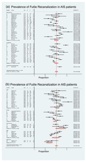 Forest Plot: Pooled Prevalence of Futile Recanalization—Stratified by Study Design and Geographical Region [8,11,12,13,14,15,16,17,18,19,20,21,22,23,24,25,26,28,29,30,31,32,33,34,35,36,37,38,39,40,41,42,43,44,45,46,51]. Abbreviations: AIS: acute ischemic stroke; CI: confidence interval; DL: DerSimonian and Laird method.