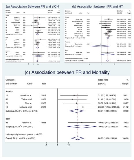 In a meta-analysis comprising 33 studies with a total of 9438 patients, HTN was significantly associated with an increased likelihood of FR (OR 1.648, 95% CI: [1.412; 1.924], p < 0.001) [8,12,13,15,16,17,18,19,20,21,22,24,25,26,28,29,30,32,33,34,36,38,39,40,41,42,43,44,45,46,47,48,51]. The association between HTN and FR was consistent in patients with anterior circulation occlusions and across prospective and retrospective study designs.