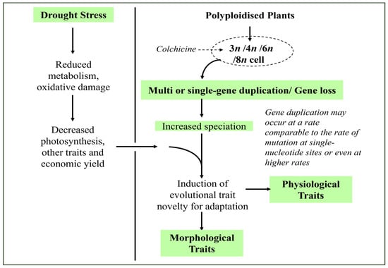 A model for the role of synthetic polyploidy in counteracting abiotic stress (drought) effects in plants. The single/multiple gene segment duplication may lead to changes in the genome with unique evolutionary traits such as increased morphological and physiological functions that are beneficial [9,10].