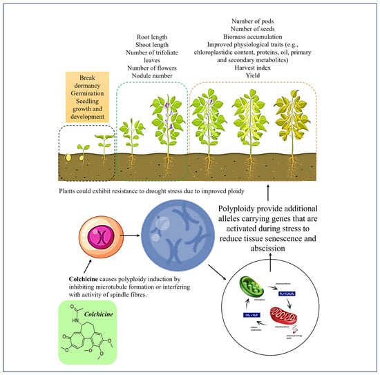 As previously mentioned, the impact of drought stress on crop production continues to intensify, increasing yield losses and causing food production reductions and spikes in food prices. Many studies have reported that these reductions take place due to the detrimental effects that drought has on the growth and development of crop plants [22,32,33,34,35,36]. The cited reports discussed various ways in which drought impairs plant growth and development but also presented potential strategies in which this abiotic stress could be circumvented. To confer drought tolerance in legumes, crop plants can be improved through colchicine-induced polyploidisation (Figure 1 and Figure 2). As already discussed, this approach may lead to intraspecific variations in traits associated with drought stress. Colchicine causes changes in the morphological characteristics of roots and shoots and even in traits associated with plant responses to cope with progressive drought (Table 2). Earlier, Essel et al. [37] reported changes in quantitative characters, such as percentage germination, plant height, number of leaves, length of longest branches, and number of branches, including pod number and yield in cowpea plants developed from seeds treated with 0.05–0.20 g/dL of colchicine.