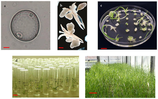 Key stages of triticale AC. (a) Uninucleate microspore (bar = 10 µm). (b) Development of ELSs from microspores after 4 weeks of androgenesis induction (bar = 1 mm). (c) Regeneration of plantlets from ELS (bar = 10 mm), (d) rooting of green plantlets in individual glass tubes (bar = 10 mm). (e) Acclimatized AC-derived green plantlets in the greenhouse (bar = 10 cm).
