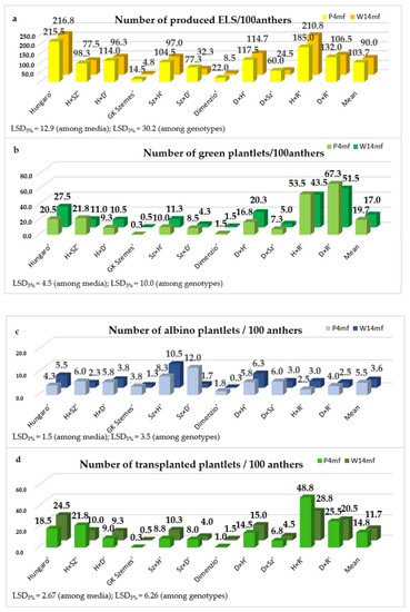 Depending on the genotype and medium, the values of plant regeneration efficiency ranged from 11.5 plantlets/100 ELS to 54.0 plantlets/100 ELS (Figure 3). The means of the genotypes were 24.9% and 24.2% for W14mf and P4mf induction media, respectively.