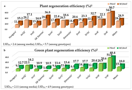 This difference was more impressive in terms of green plant regeneration efficiency. The values ranged from 1.8% to 51.0% depending on the treatments (genotype and medium). For the majority of genotypes, the percentage of green plantlet regeneration was significantly higher when using the W14mf medium compared to the P4mf medium. The means of the genotypes were 18.0% and 15.9% for the W14mf and P4mf medium, respectively.