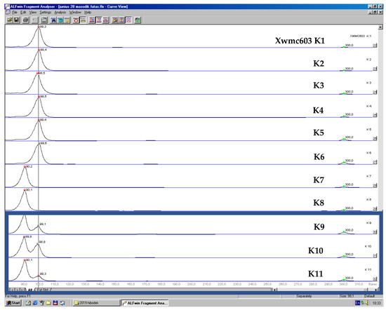 Partial result of DNA fragment analysis, allele size determination (ALFexpress II DNA analyser (Amersham Biosciences, Piscataway, NJ, USA)). Two peaks in samples K9, K10 and K11 (blue frame) indicate heterozygosity, which shows a failure of DH production.