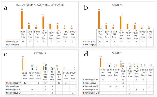 Number of homozygous/heterozygous genotypes tested with different markers ((a) Xwmc9, BARC108 and SCM150, (b) SCM176, (c) Xwmc603 and (d) SCM126) in the DH lines in DH2 generation.