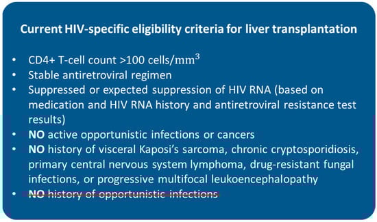 The current selection criteria can vary among different transplant centres, though they generally include a minimum CD4+ T-cell count of 100 cells/mm3, stable antiretroviral regimen (when feasible), suppressed or expected suppression of HIV RNA (based on medication and HIV RNA history and antiretroviral resistance test results), no active opportunistic infections or cancers, and no history of visceral Kaposi’s sarcoma, chronic cryptosporidiosis, primary central nervous system lymphoma, drug-resistant fungal infections, or progressive multifocal leukoencephalopathy [8,56,57]. HIV RNA levels are commonly required to be undetectable within 3–4 months from LT, although candidates who are not able to tolerate cART because of drug-associated hepatotoxicity are considered eligible for transplantation if viral suppression can be confidently predicted to occur after LT [58,59]. Having a history of opportunistic infections used to be an absolute contraindication but has been removed from the criteria as it has been shown it has no impact on outcomes, as in the above-mentioned HIV-TR study [11,60]. The present suggested eligibility criteria are summarised in Figure 1.