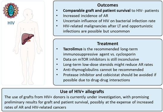 Liver transplantation in people living with HIV is associated with comparable outcomes to HIV-uninfected LT recipients in terms of graft and patient survival. For this reason, LT in PLWH should be considered standard practice, although there are peculiarities of HIV+ LT recipients which should be taken into account (as summarised in Figure 2). The incidence of acute rejection appears to be increased in PLWH, while the rate of infections after LT varies among studies, with data lacking from the DAA era. Opportunistic infections and HIV-related malignancies after LT are possible but uncommon. Drug–drug interactions and a higher risk of AR should guide the choice and dose of immunosuppressive therapies. The use of grafts from HIV+ donors is currently under investigation, with promising preliminary results for graft and patient survival, possibly at the expense of increased rates of AR and HIV-related cancers.