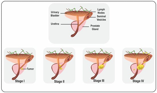CaP is generally divided into localized, locally advanced, and metastatic CaP [19]. At the advanced stage, CaP spreads from the prostate to different body parts (Figure 1). Usually, metastasis occurs through the lymphatic route to the pelvic and para-aortic lymph nodes and hematogenously spreads to the skeletal system, predominantly affecting the bones. It has also been noticed that visceral metastasis to the liver, lungs, and organs is comparatively rare and connected with intermittent pathology and a poor prognosis [20].