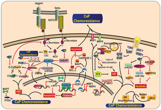 DOC-2/DAB2 interactive protein (DAB2IP) modulates various signaling pathways and suppresses metastasis by suppressing cell growth and survival and inducing apoptosis. The downregulation of DAB2IP in CaP cells leads to radio- and chemoresistance. DAB2IP-deficient cells show resistance to multiple chemotherapeutic agents due to the upregulation of WNT/β-CATENIN and, ultimately, the overexpression of the secreted heterodimeric isoform of the Clusterin (CLU) gene [95]. EMT might also play a pivotal role in CaP chemoresistance, and E-Cadherin is an important marker in the development of chemoresistance. E-Cadherin is downregulated in chemoresistant CaP cells, leading to the upregulated expression of Vimentin and Claudin-1. Moreover, the downregulation of E-Cadherin leads to the upregulated expression of the Notch signaling pathway [96]. Furthermore, zinc finger E-box-binding homeobox 1 (ZEB1), a key EMT activator, has been associated with Docetaxel resistance. The overexpression of ZEB1 is correlated with the expression of multidrug-resistance-associated protein 1 (MRP1) and ATP-binding cassette subfamily C member 4 (MRP4), a poor Docetaxel transporter. Moreover, the ZEB1-mediated upregulation of MRP4 is characterized by lower BCL2 levels and higher BAX levels and caspase 3 expressions, leading to decreased apoptosis [97]. Considering the immunological aspect, the JAK/STAT pathway is very important for the expression of PD-L1, which lets tumor cells escape cell death via a T-cell immune response [98]. Moreover, it was also observed by Xu et al. [99] that the antitumor pathways of natural killer cells may also be repressed through the expression of PD-L1 via NKDG2D ligands blocking the surface of the cells. In CRPC, natural killer (NK) cell-mediated cytotoxicity has inclined resistance, as PD-L1 and NKG2D ligand levels were dysregulated by IL-6. It was conferred that the JAK/STAT pathway blockage was shown to cause increased susceptibility to NK-cell-arbitrated death in CRPC cells [100].