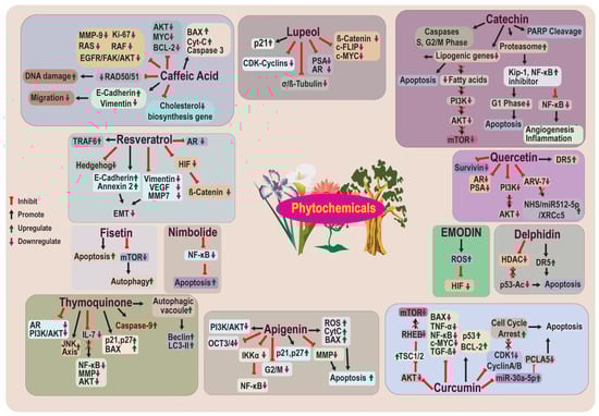 Plants are rich sources of bioactive compounds, and the secondary metabolites that are present in plants have shown excellent interspecies interaction, which can modulate the expression of various human proteins [107]. The use of phytochemicals as anticancer agents represents many bioactive compounds that have shown lesser side effects than conventional chemotherapeutic agents [108]. Phytochemicals have shown anticancer activity by targeting apoptosis, proliferation, invasiveness, and metastasis. Moreover, phytochemicals can increase the overall efficacy of clinically approved therapies, including radio- and chemotherapy [109]. Phytochemicals alone, or combined with other therapies or nanomedicines, can regulate various factors of the body to prevent or treat human CaP [110] (Figure 3). A positive correlation was suggested between an increased consumption of plant-based foods (cruciferous vegetables, whole grain bread, legumes, and vitamin C-rich vegetables) and a reduced CaP risk [109]. In this regard, we carefully describe the state-of-the-art concerning phytochemicals and their anticancer role in preventing, eradicating, and/or sensitizing CaP cells in the next section.