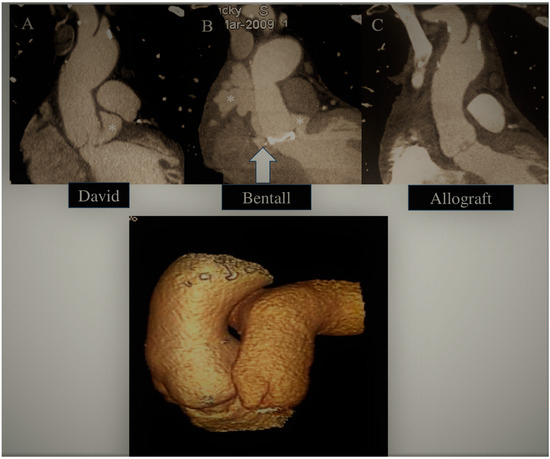 Top: Recurrent false aneurysm (asterisk and white arrow) due to endocarditis following (A) David and (B) Bentall procedures treated with (C) aortic allograft replacement. Bottom: Ross operation at 23 years follow up.