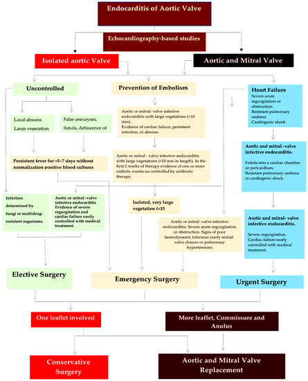 Curlier et al. [10] found that the incidence of infective endocarditis (IE) varies from 43.8% to 35.4%. Worry about IE sustained by an active process affects both the natural and prosthetic valves, with different incidences-around 50% for native valve endocarditis (NVE) and 10% for prosthetic valve endocarditis (PVE)—as reported in the primary surgical series of two referral centers of experience. The pathoanatomical lesion in IE may affect one or more heart valves, varying in the degree of extension to different areas of the hear [11,12,13,14].