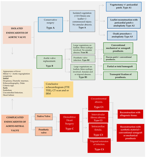 Patients with positive Staphylococcus culture results are at an elevated risk of developing complicated and aggressive lesions, including aortic root abscess formation and involvement of intervalvular fibrosa and heart trigones. Moreover, such patients exhibit a significantly higher mortality rate compared to those infected by other pathogens. E. faecalis, a nosocomial opportunistic bacterium, is among the species that exhibit exceptional aggressiveness. The prevalence of this causative pathogen is high in cases of elaborate and complicated cardiac infections, emphasizing the necessity of alternative therapeutic methods such as immunotherapy or immunoprophylaxis. Antibiotics should be initiated promptly upon obtaining blood cultures. However, clinicians may opt for culture-guided therapy if the patient is stable [52,53,54,100,122]. Although empirical antibiotic regimens for treating native and prosthetic valvular endocarditis are based on guidelines established by the British Society for Antimicrobial Chemotherapy [100], resistance demonstrated by E. faecalis towards these treatments may necessitate surgical intervention, which may influence the selection of demolitive surgery. Intervalvular fibrosa extension, circumferential annular abscess, and the development of intracardiac fistulae are anatomopathological criteria that dictate the need for extensive removal and thorough cleaning of infected tissue. This process is followed by reconstruction using allogeneic tissues for both the aortic and mitral valves, as shown in Figure 3, Type C. It is important to adhere strictly to metric and unit standards throughout the process.