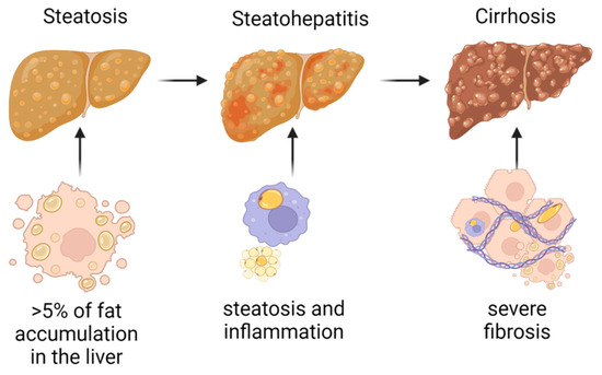 The global prevalence of non-alcoholic fatty liver disease (NAFLD) is 25%, registering an alarming increase in recent years (from 15% in 2005 to 32% in 2023) as a consequence of the dramatic change in lifestyle that mainly includes an increased level of sedentarism and a high-fat (PUFA) and high-sucrose and -artificial sugars diet [1,2]. NAFLD occurs secondarily to the accumulation of excess triglycerides in the liver in the absence of excessive alcohol intake, which can lead to the appearance of non-alcoholic steatohepatitis (NASH) in approximately 30% of patients, which evolves in 10–20% of cases to liver cirrhosis [3,4]. Steatosis is defined as fat accumulation in liver volume more than 5%; steatohepatitis features steatosis, hepatocyte ballooning, and inflammation with rapid progression to fibrosis; and cirrhosis is defined by a diffuse hepatic process characterized by severe fibrosis and conversion of the normal liver architecture (Figure 1) [5]. The definition of NAFLD precludes alcoholic liver disease. Although there is no consensus on the threshold of alcohol consumption to exclude NAFLD, a level of 30 g/day for men and 20 g/day for women is commonly used [6]. However, light (1.0–9.9 g/day) or moderate (10.0–29.9 g/day; 10.0–19.9 g/day for women) alcohol consumption in patients with NAFLD is not uncommon [7]. The liver injury induced by alcohol encompasses structural damage to hepatocytes with lipid accumulation and inflammation. The pathways of alcohol-induced liver injury include increased regulatory activity of kinases, transcription factors, kinases, and microRNAs (miRNAs) [8].