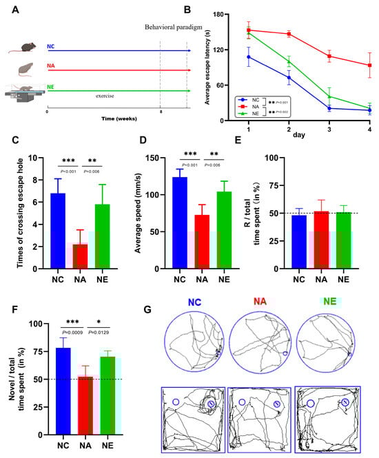 2.1. Aerobic Exercise Ameliorated the Deficits of Cognitive Function in Barnes Maze and Novel Object Recognition (NOR) Test