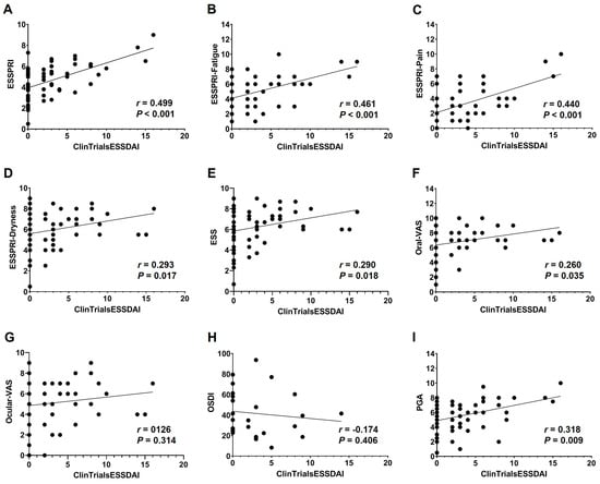 Correlations between Clinical Trial ESSDAI (ClinTrialsESSDAI) and subjective clinical disease activity indexes in patients with primary Sjögren’s syndrome. The correlation between ClinTrialsESSDAI and (A) ESSPRI, (B) ESSPRI-Fatigue, (C) ESSPRI-Pain, (D) ESSPRI-Dryness, (E) ESS, (F) oral-VAS, (G) ocular-VAS, (H) OSDI, and (I) PGA. ESSDAI, EULAR Sjögren’s Syndrome Disease Activity Index; ESSPRI, EULAR Sjögren’s Syndrome Patient Reported Index; ESSPRI-Fatigue, fatigue domain of ESSPRI; ESSPRI-Pain, pain domain of ESSPRI; ESSPRI-Dryness, dryness domain of ESSPRI; ESS, EULAR sicca score; Oral-VAS, visual analogue scale for oral dryness; Ocular-VAS, visual analogue scale for ocular dryness; OSDI, ocular surface disease index; PGA, patient’s global assessment.