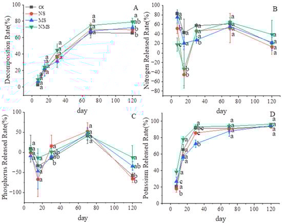 Patterns of the decomposition rate of wheat straw (A); the released rate of different nutrients (B–D); CK, straw natural composting; NS, straw compositing with nitrogen application; MS, straw compositing with SDMI application; NMS, straw compositing with nitrogen and SDMI co-application. Each bar is the standard deviation of three replicates. Numbers followed by different lowercase letters in the same row are significantly different at p > 0.05.
