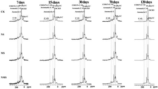 Figure 2 shows the 13C multi-CP/MAS NMR and the corresponding dipolar-dephased spectra (DD) from all the treatments, which provides quantitative structural information. The comparative abundance of alkyl C (0−44 ppm) and aromatic C−C (113−142 ppm) all increased, but a reduction in the relative abundance of O–alkyl C (64−93 ppm) over decomposition time. The A/OA ratios of straw residue under NMS and MS conditions gradually increased from 7 to 70 days, slightly declining at 120 days. The A/OA ratios of straw residues under the NMS and MS conditions were higher than those under the CK and NS conditions from 7 days to 30 days, but it was lower than when under the CK condition at 70 days (Table 1).