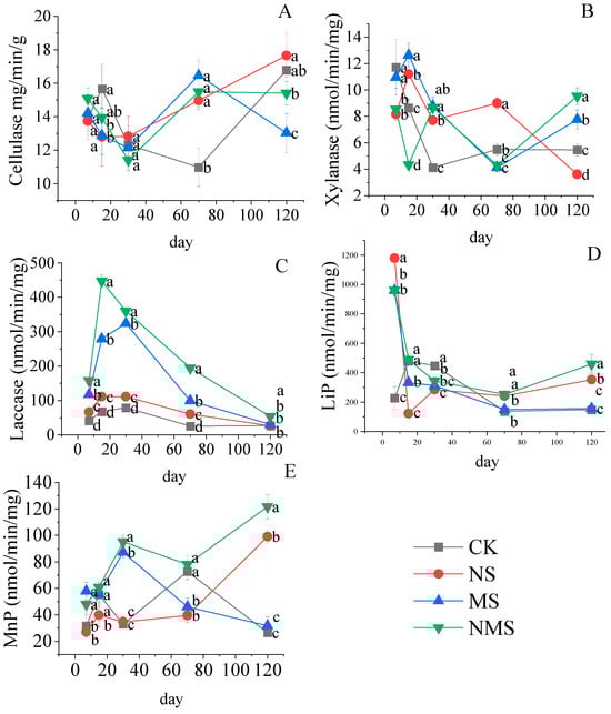 The dynamic changes of cellulose (A), xylanse (B), laccase (C), lignin peroxidase (LiP) (D) and MNP manganese peroxidase (MnP) (E) enzymes at different stages of straw decomposition. CK, straw natural composting; NS, straw compositing with nitrogen application; MS, straw com-positing with SDMI application; NMS, straw compositing with nitrogen and SDMI co-application. Each bar is the standard deviation of three replicates. Numbers followed by different lowercase letters in the same row are significantly different at p > 0.05.