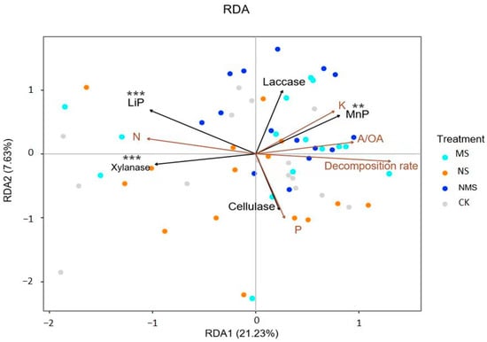 Redundancy analysis (RDA) of enzyme activity, the nutrient release rate and the decomposition rate of straw. CK, straw natural composting; NS, straw compositing with nitrogen application; MS, straw com-positing with SDMI application; NMS, straw compositing with nitrogen and SDMI co-application. LiP and MNP stands for lignin peroxidase and manganese peroxidase, respectively, ** and *** stands for p < 0.01 and p < 0.001, respectively.