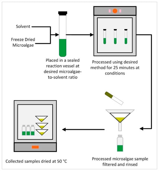 In general, three samples of microalgae, containing approximately 1 g of each, processed at the desired grinding speed, were weighed and inserted into the appropriate reaction vessel. Each experimental trial in the triplicate set was performed simultaneously, with each triplicate set being performed subsequently. The desired type and volume of solvent, as determined by the experimental parameters, was slowly added to the reaction vessel containing the microalgae. The reaction vessel was gently swirled by hand to help ensure even wetting and homogeneity of the microalgae/solvent mixture. The reaction vessel was then sealed and inserted into the experimental apparatus appropriate for the various factors considered (e.g., microwave, sonication, and autoclave). The microalgae and solvent were allowed to be in contact for 25 min at experimental conditions. After 25 min, the reaction vessel was removed from the experimental apparatus and emptied into a pre-weighed 12.5-cm double ring 102 filter paper. The vessel was rinsed with additional solvent to remove all residual microalgae from the vessel. The liquid was collected in a pre-weighed container. The containers of liquid were dried in a drying oven at 50 °C until a stable dry weight was achieved. The filter with the residual microalgae was also dried in a drying oven at 50 °C until any residual solvent had evaporated. The weight of the filter and the container after drying were recorded to determine the total residual microalgae and extractant.