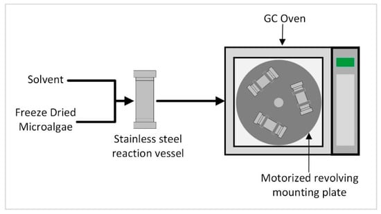 Another method to increase the internal energy of microalgae in order to facilitate extraction is to increase the temperature of the algae–solvent solution. To explore this option, a small-scale batch reactor was built using a repurposed gas chromatography oven to allow temperature control. A turntable attached to a motor with clasps to hold each sample in place provided agitation in the reactor. The small-scale batch reactor allowed the temperature to be tested as a method to facilitate extraction without any additional cell wall disruption techniques being utilized.