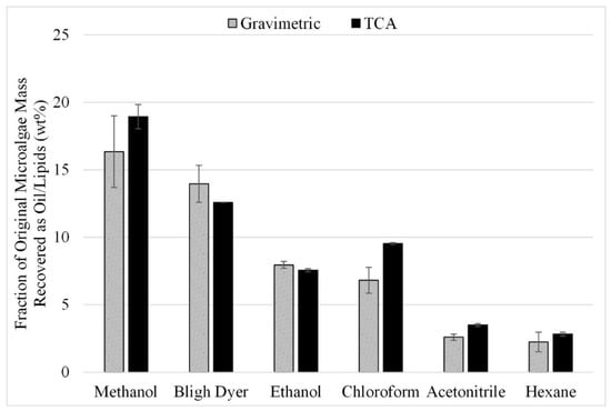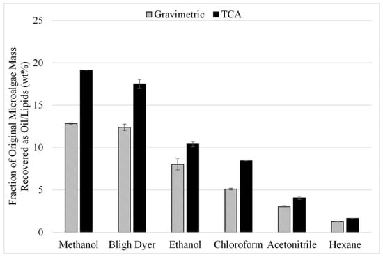 In another set of experiments, the effect of in situ transesterification for the enhancement of lipid extraction was studied. The in situ transesterification study was completed in two parts. First, six different solvents were tested since the best solvent for extraction of the esters might not be the same as that identified for the acid form of the lipids. The extraction efficiency of these solvents with sonication was determined at the following conditions: 500 rpm grinding speed, 1:10 microalgae-to-solvent ratio, and 50 °C temperature. The gravimetric and TCA results from the six experiments performed in triplicate for the in situ transesterification study are shown in Figure 11.