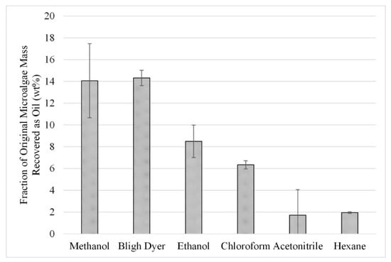 A preliminary solvent screening study was completed which analyzed a wide range of solvents for lipid extraction from autotrophic microalgae. In these initial experiments, the solvents being screened were methanol, ethanol, hexane, acetonitrile, chloroform, and Bligh Dyer. Both microwave and sonication-assisted extraction were also evaluated in the screening study. All experiments were performed using a microalgae-to-solvent ratio (g:mL) of 1:10. This initial set of experiments was used to assess the extraction efficiency of each solvent and to provide the information needed to down-select to a more limited set of solvents for the experiments studying solvent extraction in combination with other techniques.