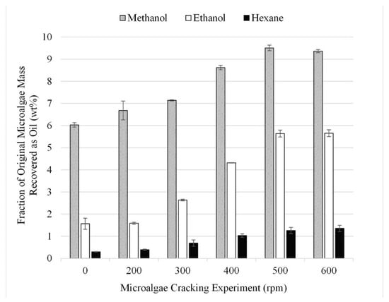 It was determined that grinding the microalgae at 500 rpm, which resulted in 9, 5, and 1 wt% recovery for methanol, ethanol, and hexane, respectively, was the optimum pretreatment condition, as at speeds above 500 rpm no additional lipids were recovered during extraction. This conclusion is consistent with the findings from previous studies which suggest mechanical pre-treatment should be performed before performing chemical extraction [23].