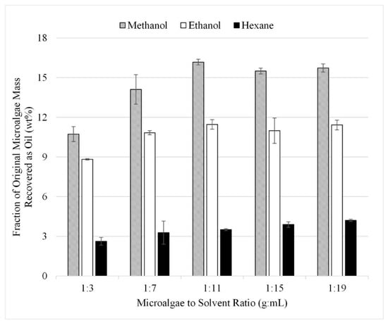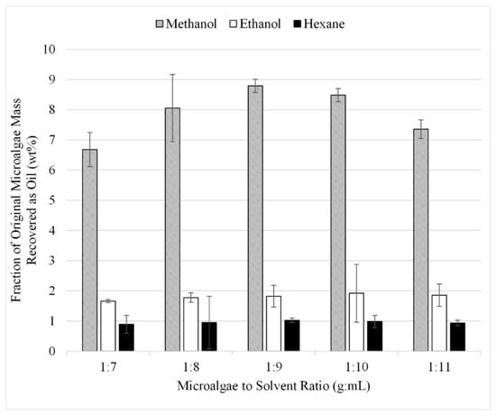 The effect of the microalgae-to-solvent ratio on the extraction efficiency was completed in three studies. The first study utilized microwave-facilitated extraction at 80 °C to analyze a wide range of microalgae-to-solvent ratios following the methods described in Section 2.3.1. An operating temperature of 80 °C was chosen to allow all extraction experiments performed with methanol, ethanol, and hexane to be completed at the same temperature. Hexane experienced issues with inconsistent and unpredictable system heating when run at higher temperatures. A temperature of 80 °C was chosen to prevent this effect. The microalgae-to-solvent ratios (g: mL) which were initially studied were 1:3, 1:7, 1:11, 1:15, and 1:19. Each ratio was studied with microwave assistance and methanol, ethanol, or hexane.