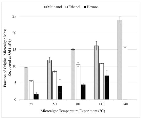 The effect of microwave-facilitated extraction on efficiency was determined by performing the extraction protocol described in Section 2.3.1 with the use of microwave at several temperatures. By utilizing microwaves at various temperatures, the effect of microwaves can be directly compared to extraction efficiency facilitated by increasing temperature without microwaves. Microwave-facilitated extraction experiments were performed at 25, 50, 80, 110, and 140 °C with either methanol, ethanol, or hexane as the solvent. In this experiment, 140 °C was the upper limit due to pressure and temperature limitations in the microwave system. No results were obtained at 110 °C or 140 °C with hexane. When operating with hexane at temperatures above 80 °C, the microwave PID controller was unable to properly analyze the internal temperature of the mixture and continued to call for power to heat beyond the temperature set point.